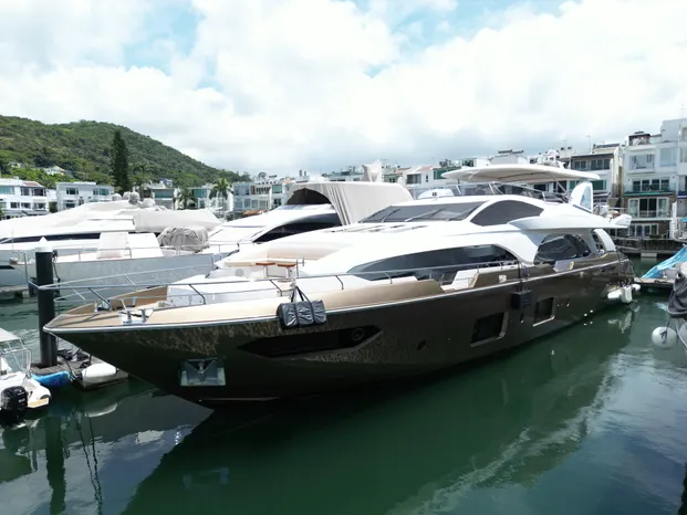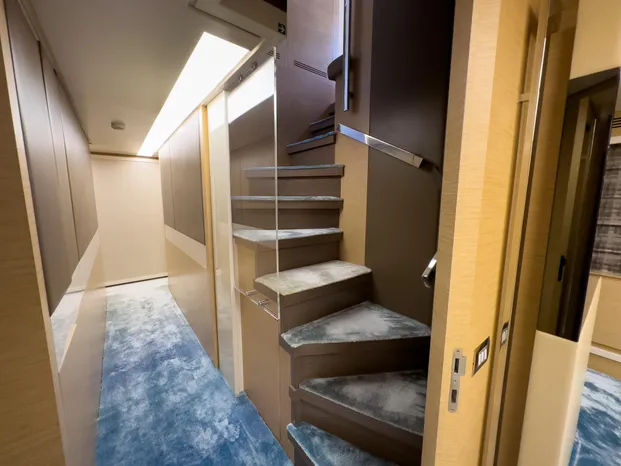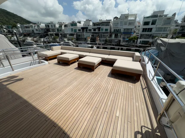 Teak floor on the flybridge, main deck, side deck, bow, and swim platform Structural staircase to the flybridge with teak steps