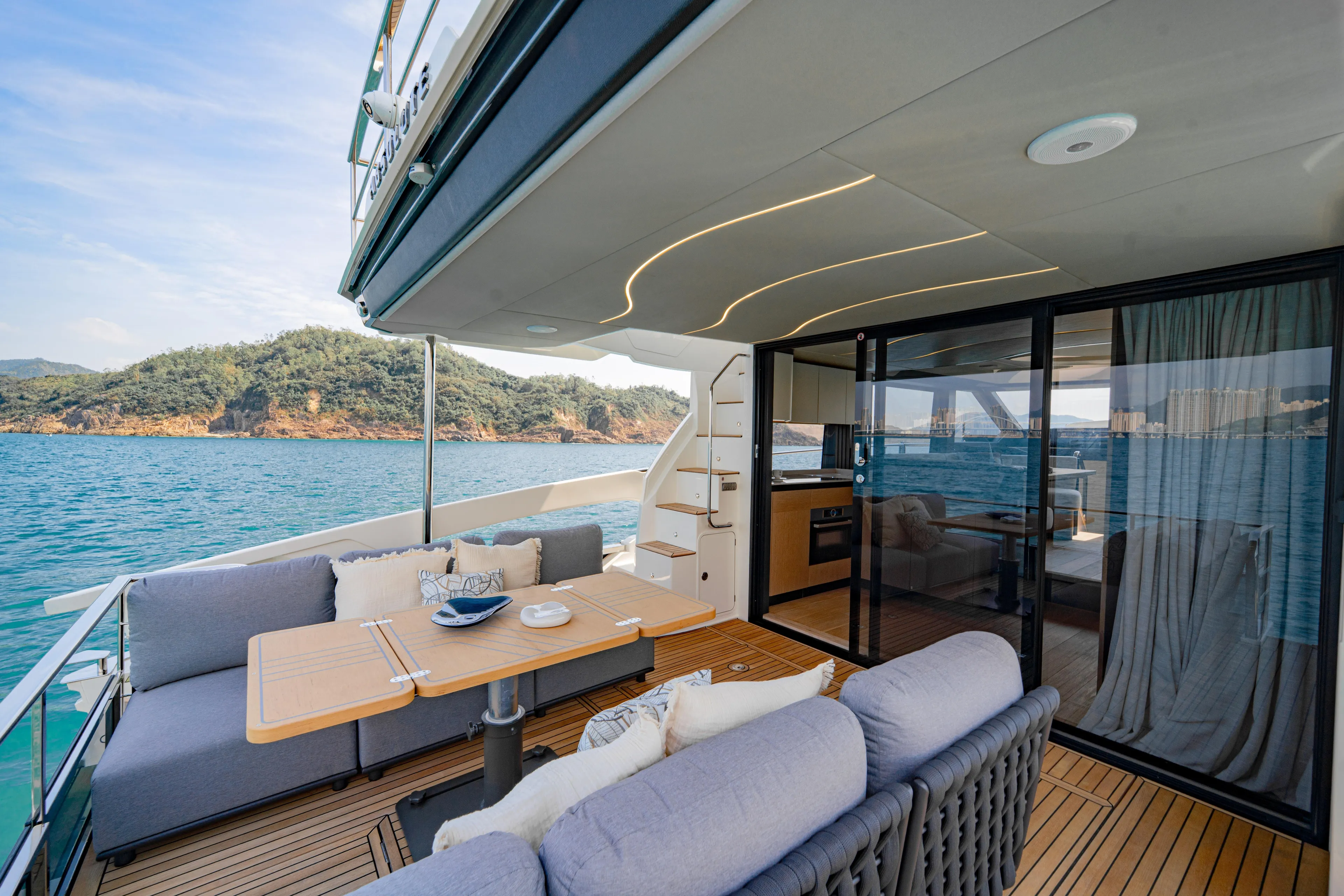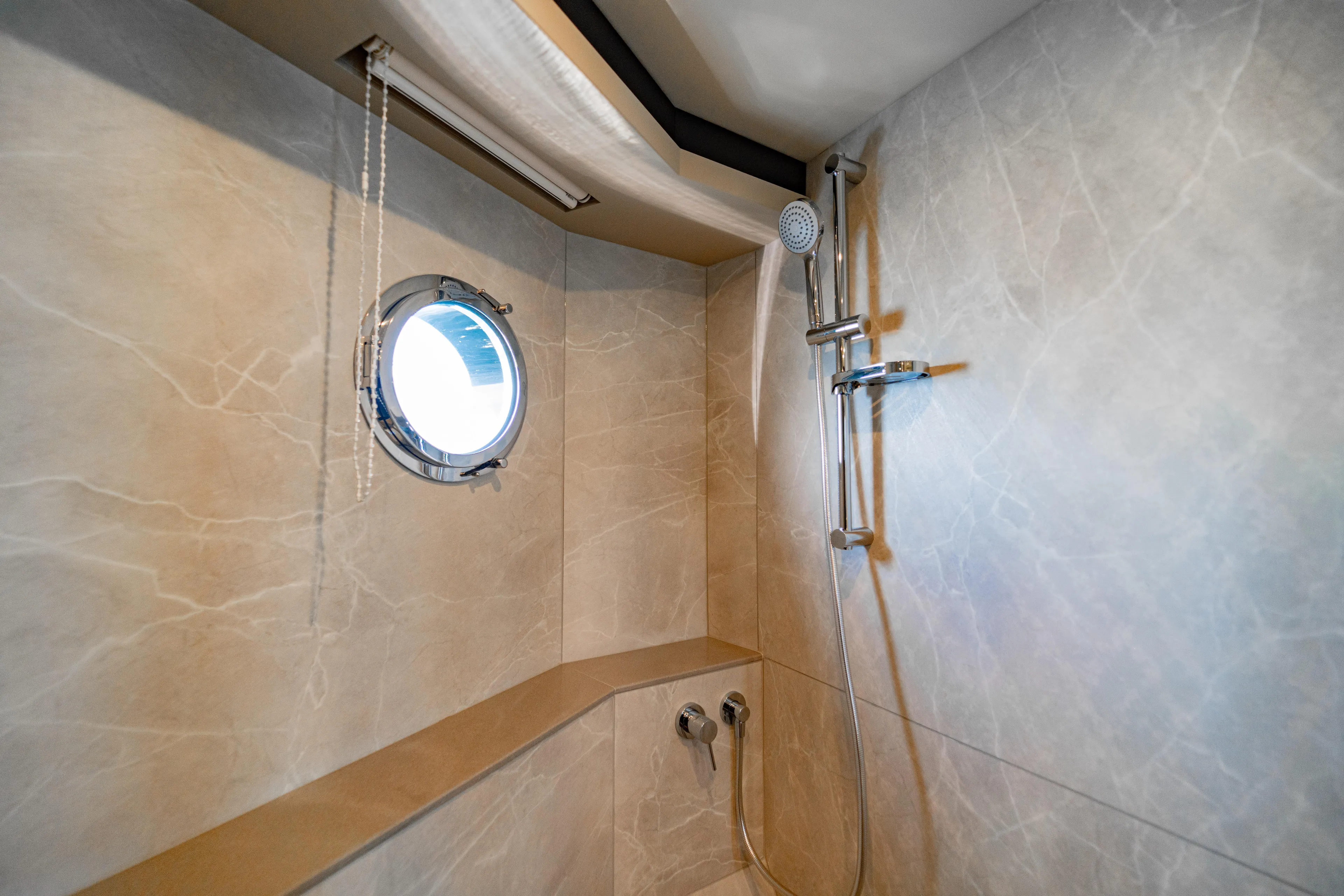 - Fourth aft cabin with bathroom (WC, basin and shower), accessible from the aft platform, instead of the aft storage compartment (it excludes bathroom in aft storage)