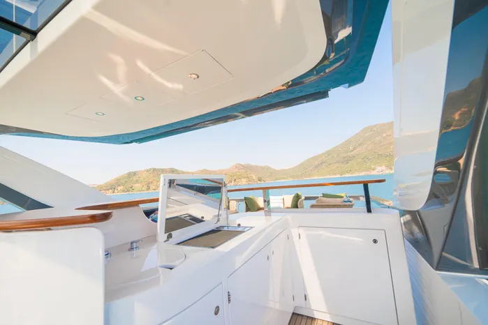 - Flybridge - Plexiglass stairs hatch, dining table in Teak with C-shaped sofa, bow sunbeds, single helm seat
