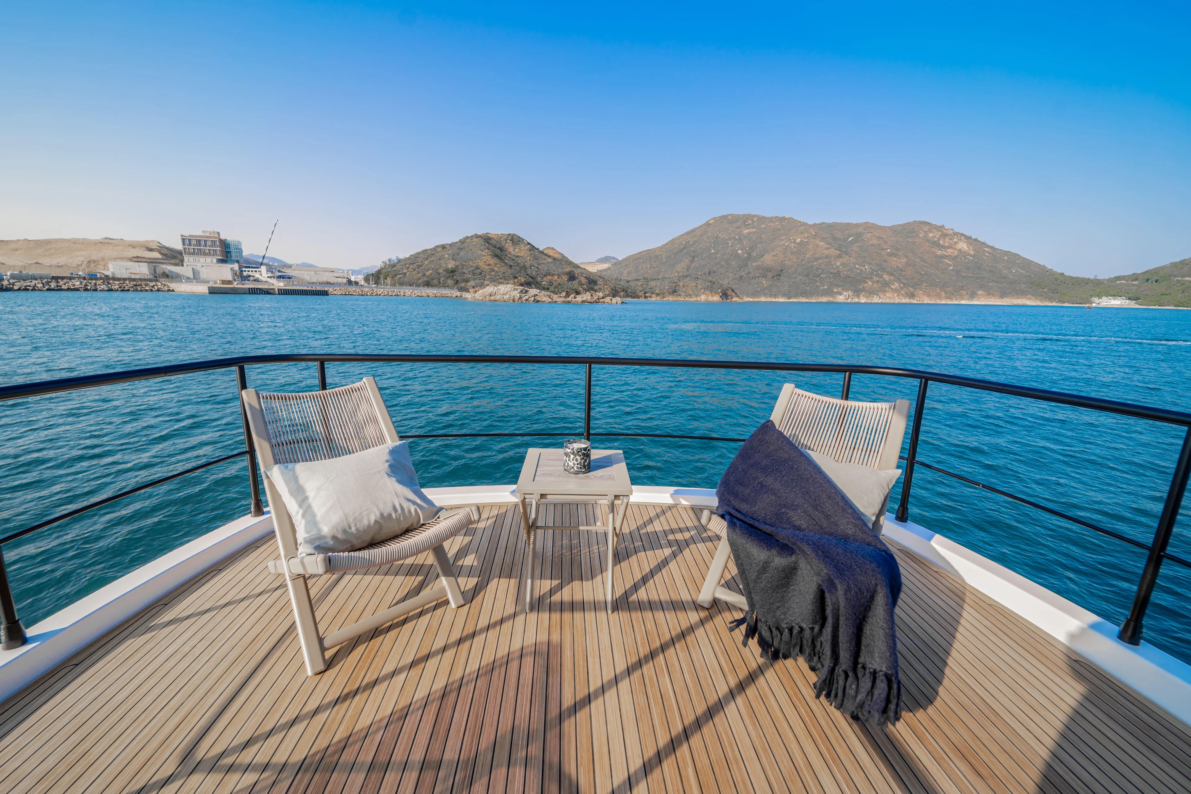 - Foredeck lounge with convertible bench/sunbed in standard simil leather and teak table