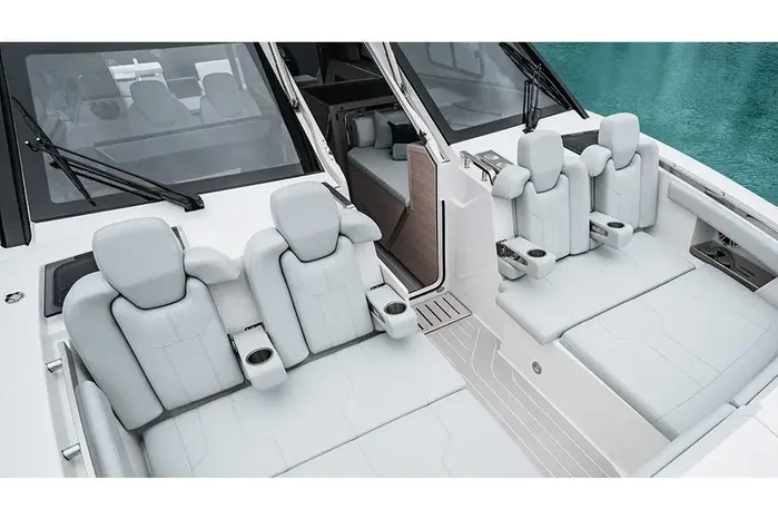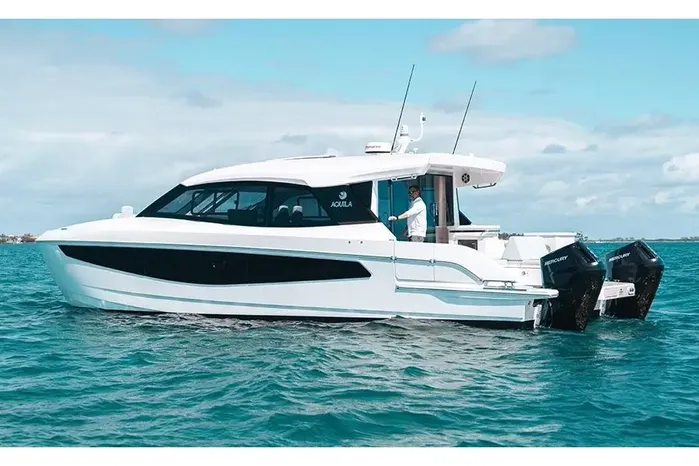 The Aquila 42 Coupe power catamaran delivers both sport boat thrills and yacht comforts. Step aboard and you'll immediately appreciate how this boat refuses to compromise. Its generous beam creates remarkable space for entertaining, while the single-level layout flows intuitively from salon to cockpit. This fresh design captures all the excitement of a sport boat with double stepped hulls while delivering premium features—two private cabins with en-suite bathrooms and separate showers.