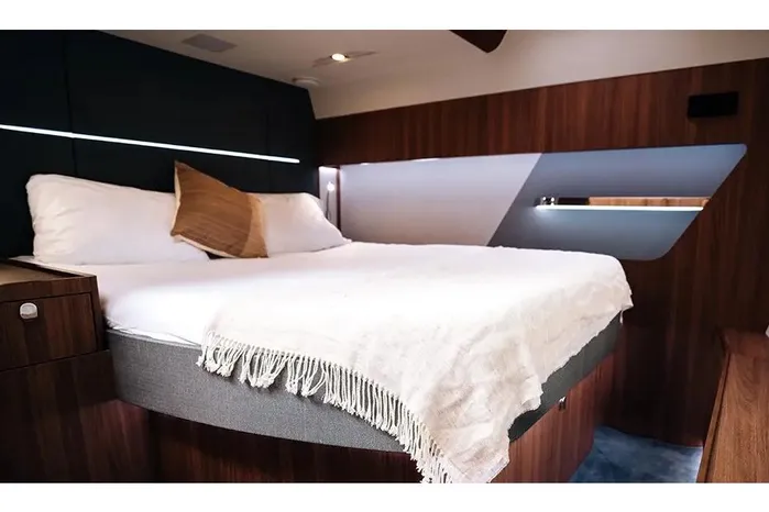 Wide decks and appointed interiors create extraordinary living spaces. The beautifully designed primary and guest cabins, each with en-suite bathroom and shower, turn weekend excursions into unforgettable getaways. Social spaces like the cockpit bar window and sheltered bow lounge make hosting sunset gatherings as effortless as escaping for a private retreat.