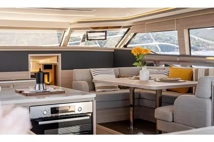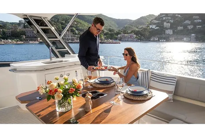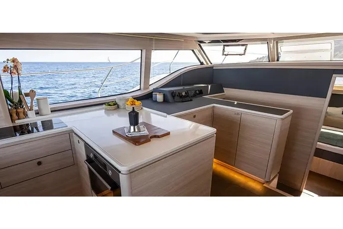 Step aboard and discover expansive outdoor areas with stylish lounges and integrated gathering zones perfect for entertaining. The open-concept interior features panoramic windows that flood the salon with natural light and ocean views, creating a spacious living area with full galley accompanied with household sized refrigeration and induction cooktop. The rear salon window and sliding main entrance door opens to create seamless indoor/outdoor entertainment space that enhances every gathering.
